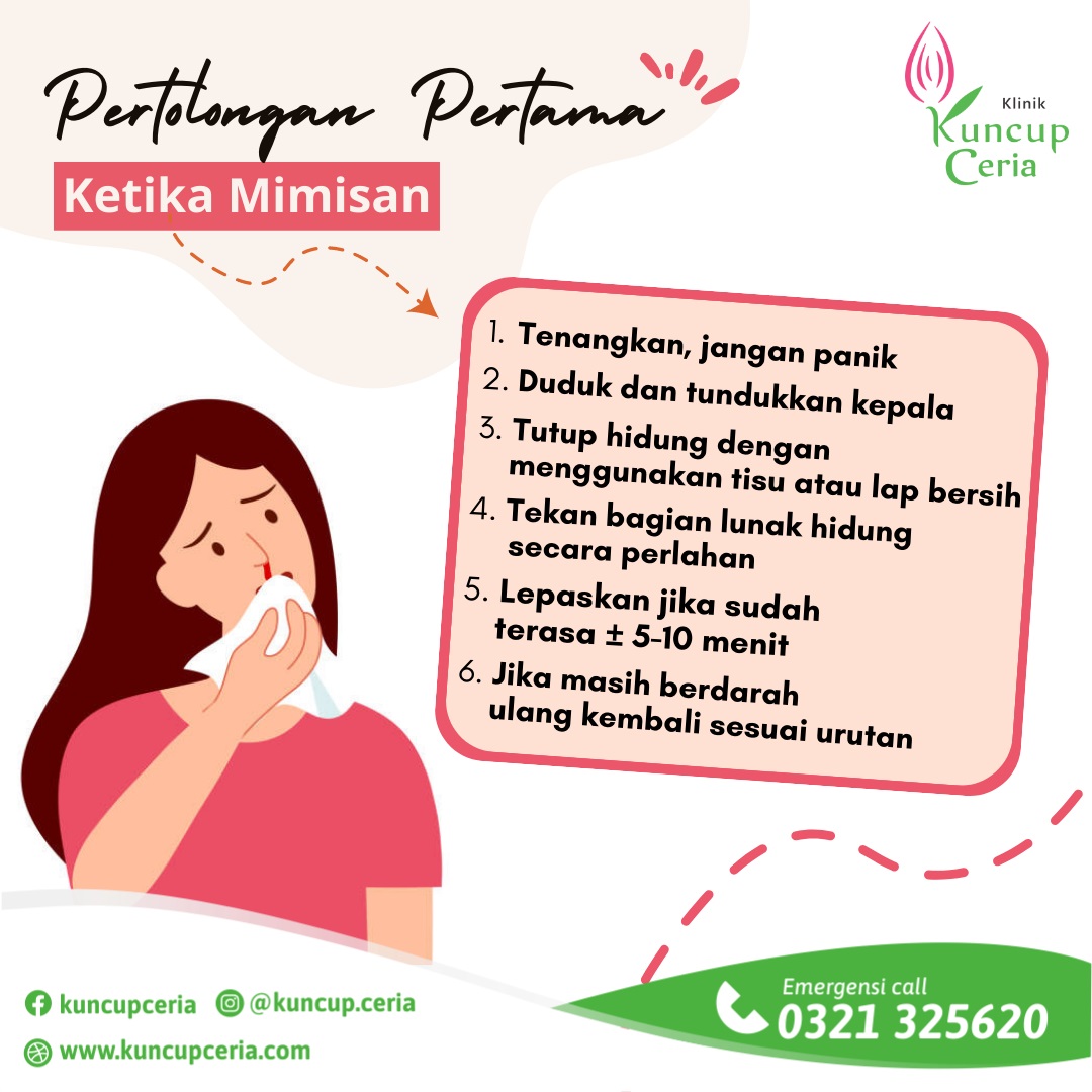 Mimisan atau keluarnya darah dari hidung sering membuat sebagian orang panik. Padahal, mimisan tidak selalu menandakan penyakit serius. Malahan mimisan paling sering disebabkan oleh udara yang kering. Selain udara kering, kebiasaan mengupil, meniup hidung, cedera pada hidung, alergi sampai efek samping obat juga bisa menyebabkan mimisan. Nah, ada beberapa hal yang harus Anda lakukan supaya mimisan cepat berhenti.