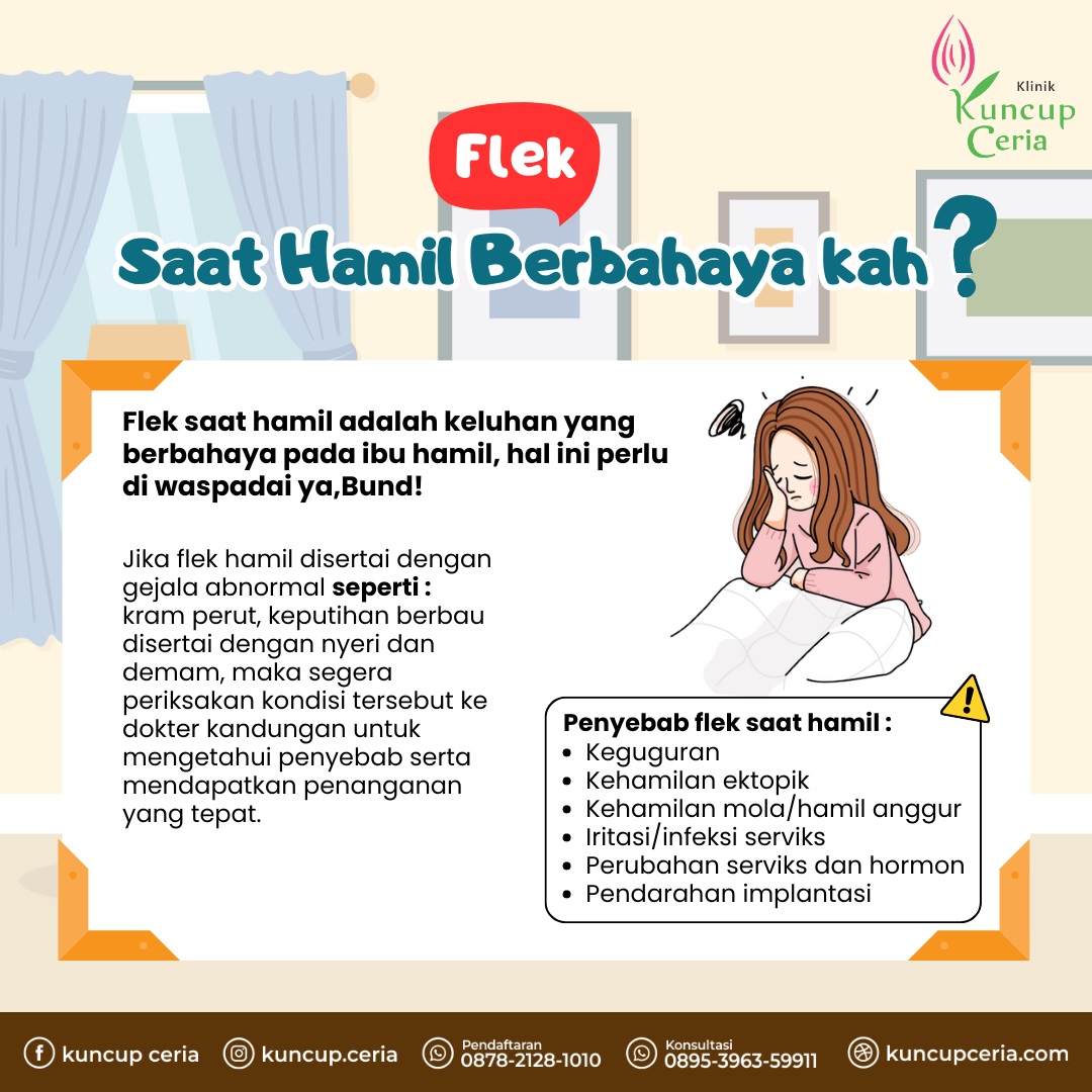 Kondisi ini umumnya tidak berbahaya, namun tetap perlu diwaspadai. Pasalnya, flek saat kehamilan juga bisa menjadi salah satu tanda adanya gangguan tertentu, terlebih jika disertai gejala abnormal lainnya. Flek saat hamil adalah keluhan yang berbahaya pada ibu hamil, hal ini perlu di waspadai ya,Bund!